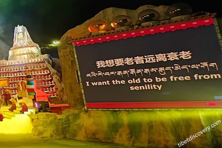 Garments actors wear is adjusted to be more ancient local style. More impressive, you can enjoy the splendid Tibetan Dance and Singings, such as over 300 performers presenting Dagya dance (打阿嘎), Zhuo Dance (卓舞) – the most difficult dance in Tibet and Tibetan Drama. Every prop appeared on the stage is different from the usual pattern, cows, sheep, yaks and crops on the slope are all alive for real. Small details you noticed like butter ever-burning lamps, Mani stones, huge blue masks and Thangkas are added to give audiences a visual taste of charm of classic Tibetan culture.